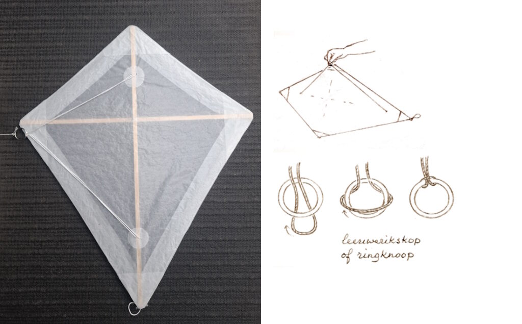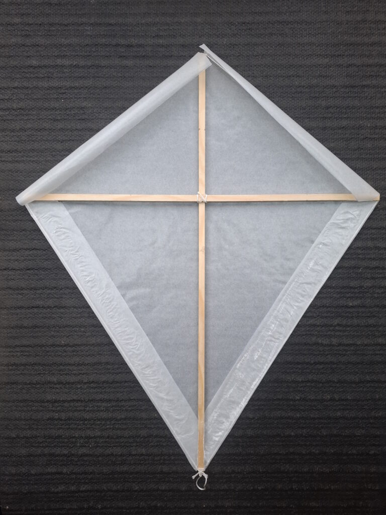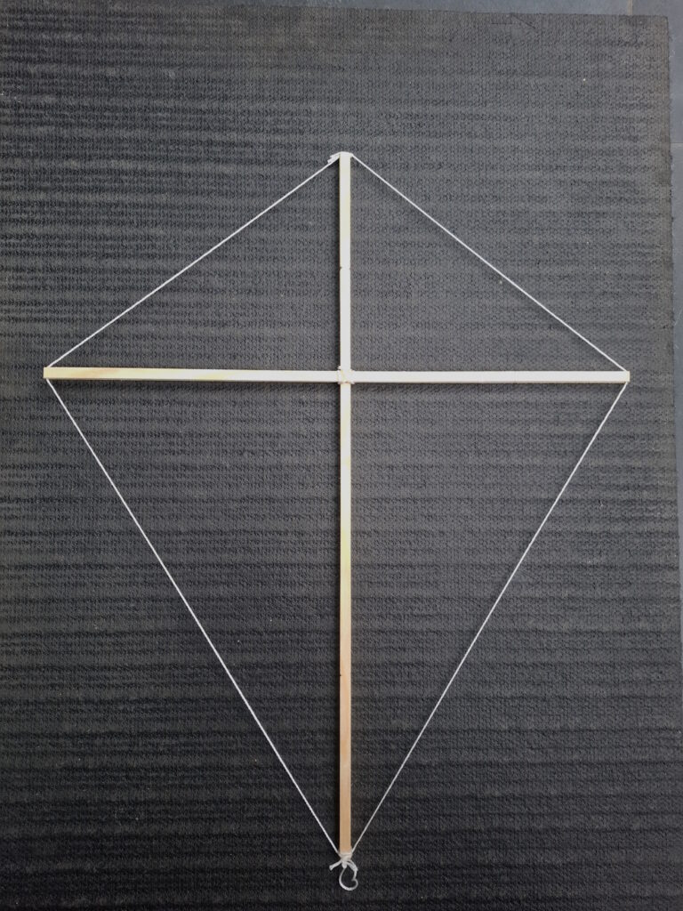 De outline van de vlieger. Knoop sterk, dun bindtouw (lengte ongeveer 2,50 meter) aan de onderste gleuf van de lange stok. Vorm nu het geraamte door de draad rondom, door alle inkepingen van de uiteinden te leiden, te beginnen bij de onderste. Knoop de draad op de onderste gleuf weer vast. Er moet een goede spanning op het touw staan , maar niet teveel: de stokjes mogen niet krom trekken. Maak hierbij meteen een lus om later de staart aan te bevestigen. Zie tekening 1. In de inkepingen kun je eventueel een druppel lijm aanbrengen zodat het touw nog beter blijft zitten. Ook op de knoop beneden kun je wat lijm aanbrengen.