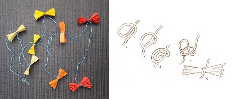 De staart zorgt dat de vlieger stabiel in de lucht blijft hangen. Neem een touw met een lengte van 4 à 5 keer de lengte van de vlieger. Maak “harmonicawaaiertjes” van papiertjes van plm 10x15cm (een A4tje 2x gevouwen). Bevestig ze op ongeveer 20 cm afstand van elkaar. De knoop op afbeelding 3 is hiervoor heel handig. Lager op de staart zitten de bundeltjes papier wat verder uit elkaar. Als de vlieger gaat “dansen” kun je het laatste bundeltje wat verzwaren.